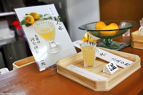 這美人水,是使用糺の森裡秋天生長的金黃色果實,搭配神水一起調和出來的飲品,喝起來像是檸檬蜂蜜水的口感。